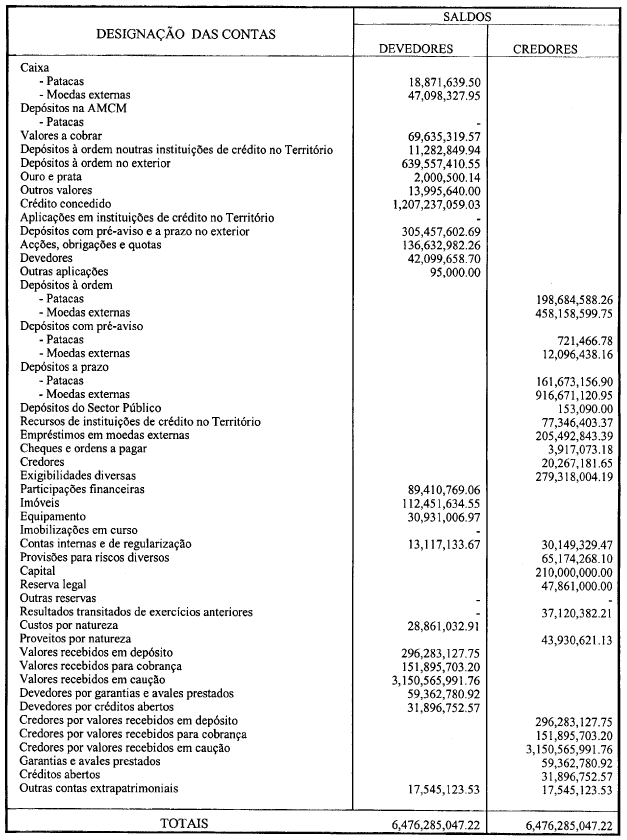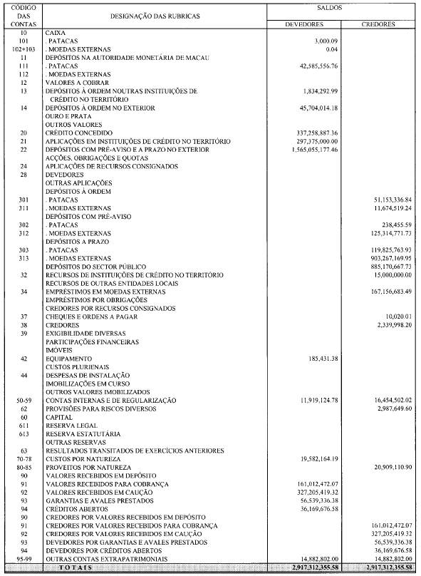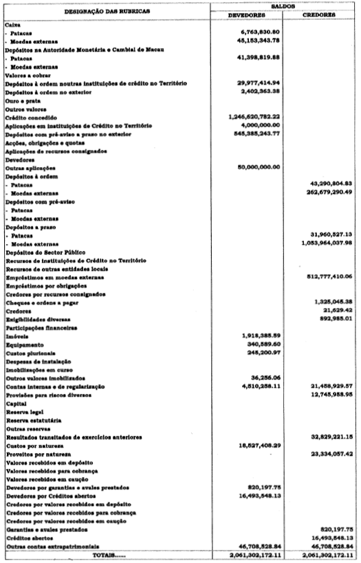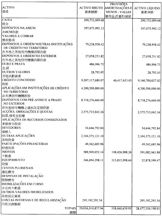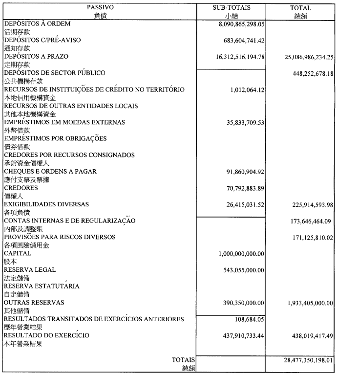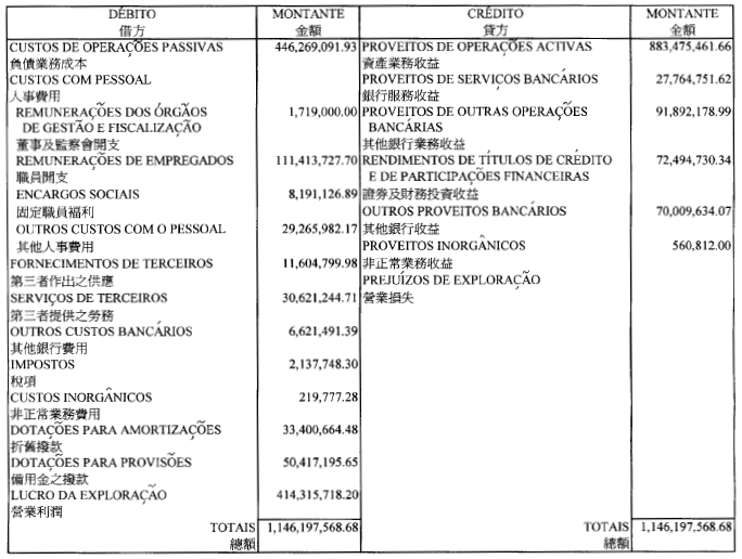 Beneficiado das condições muito melhoradas no ano de 2005 no exercício das actividades bancárias em Macau, o Banco registou excelentes resultados, tendo conhecido níveis jamais registados quer em termos de depósitos recebidos quer no respeitante a créditos concedidos. O saldo de depósitos no fim do exercício em apreço registou o aumento de 2,888 mil milhões de patacas, um acréscimo de 12,75%, em relação ao do exercício anterior, por outro lado, o saldo dos créditos concedidos, registado no fim do exercício, aumentou em 1,166 mil milhões de patacas, um crescimento de 14,5%, face ao do exercício anterior. Os lucros depois do imposto foram de 437 milhões de patacas, i.e. 1,2 vezes maiores do que os apurados no exercício anterior. O valor dos créditos mal parados tem diminuído. Tais resultados foram obtidos graças ao apoio dos diversos sectores comerciais e industriais e dos clientes, bem como ao empenhamento do pessoal do Banco no evitar dos riscos e no desenvolvimento das actividades, aos quais o Banco aproveita o ensejo para endereçar os mais penhorados agradecimentos.