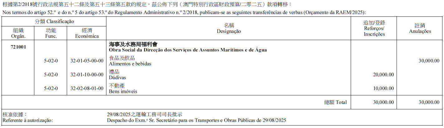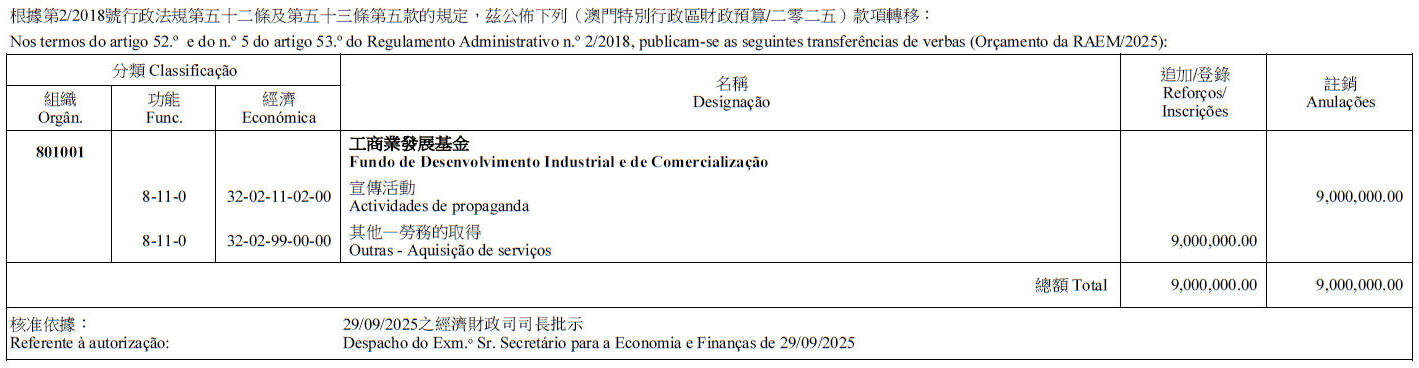 根據第2/2018號行政法規第五十二條及第五十三條第五款的規定,茲公佈下列(澳門特別行政區財政預算/二零二五)款項轉移: