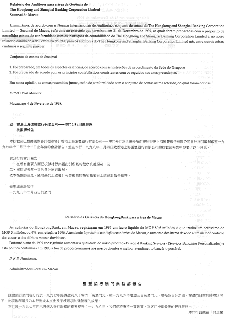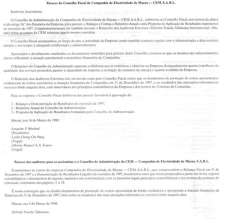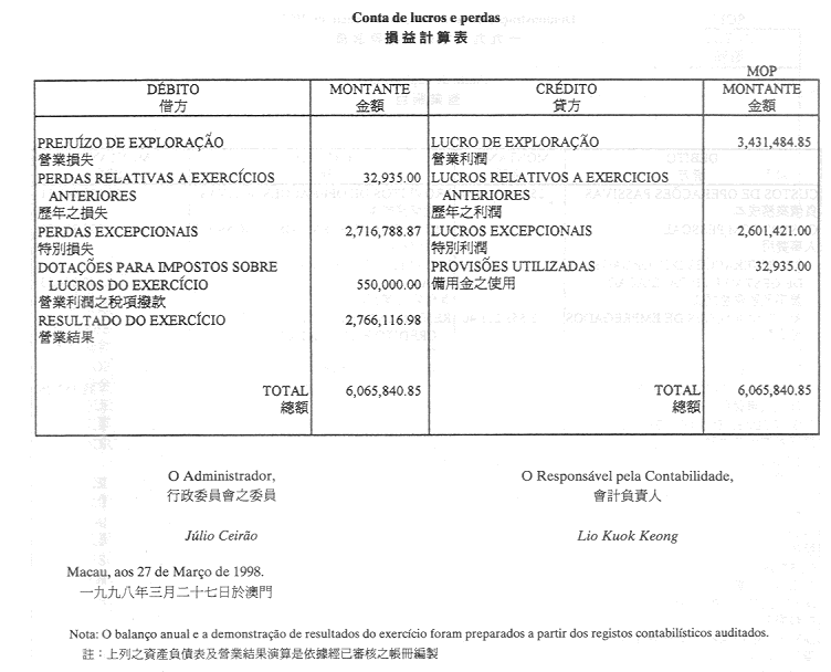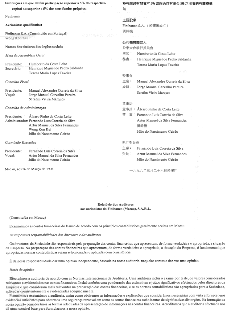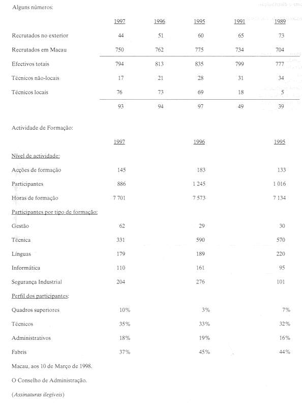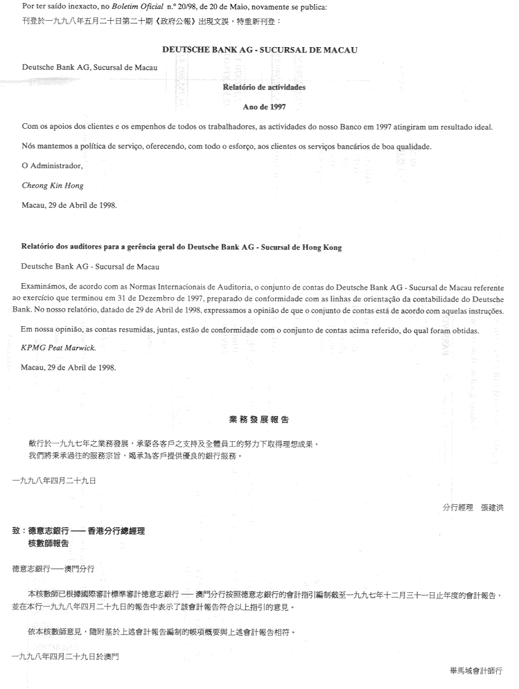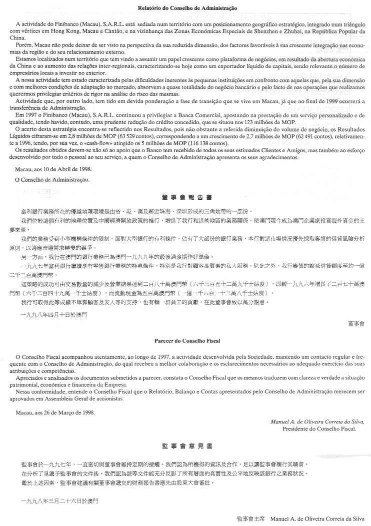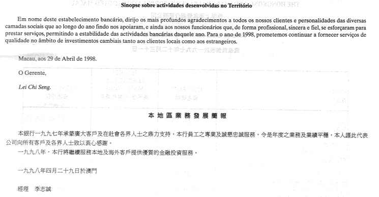Macau, aos oito de Maio de mil novecentos e noventa e oito. — Os Gerentes, Yang Kai — Zhong Shao Hui.